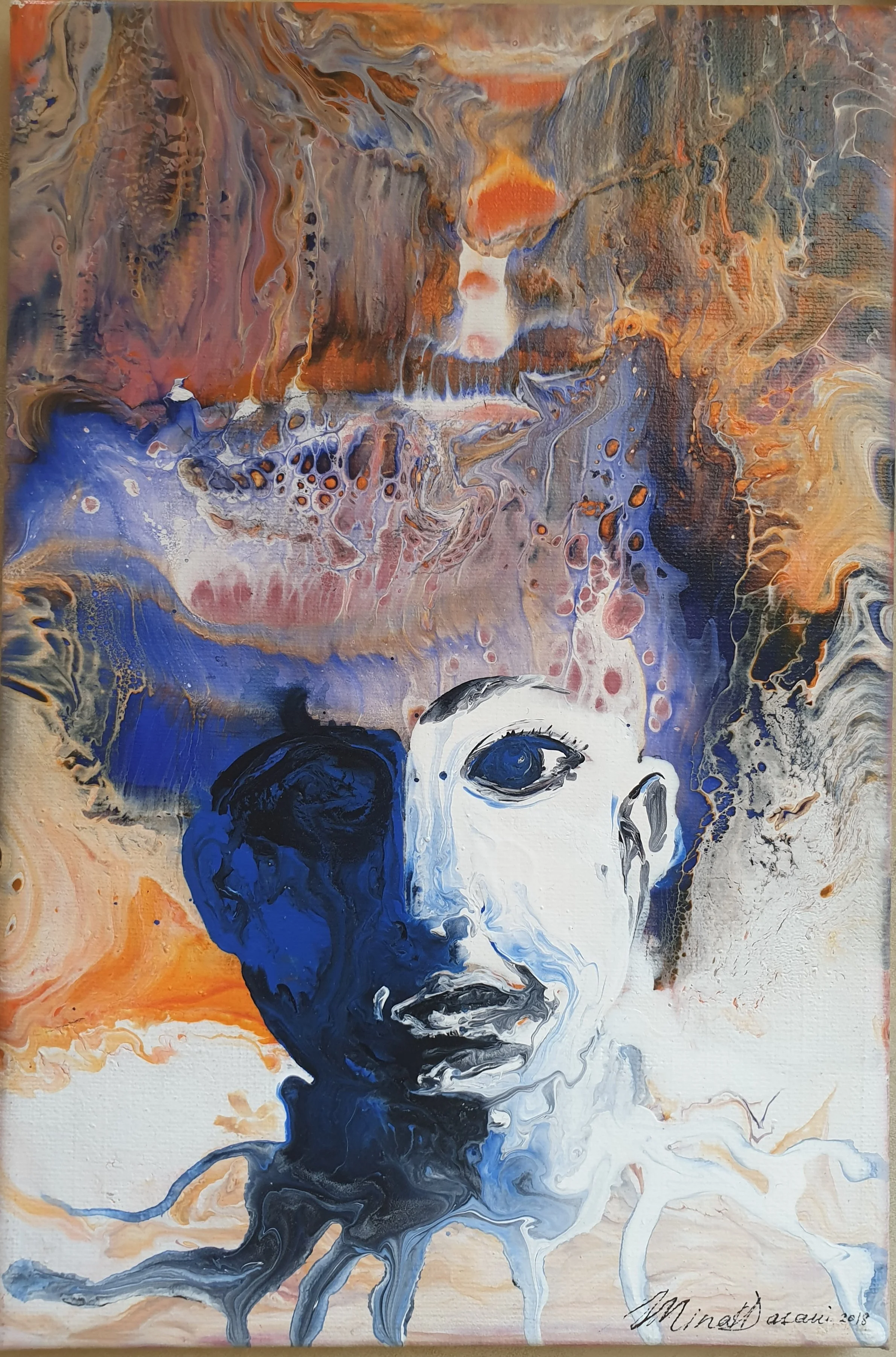 An experiment with fluid acrylics that led to the emergence of a person's face.