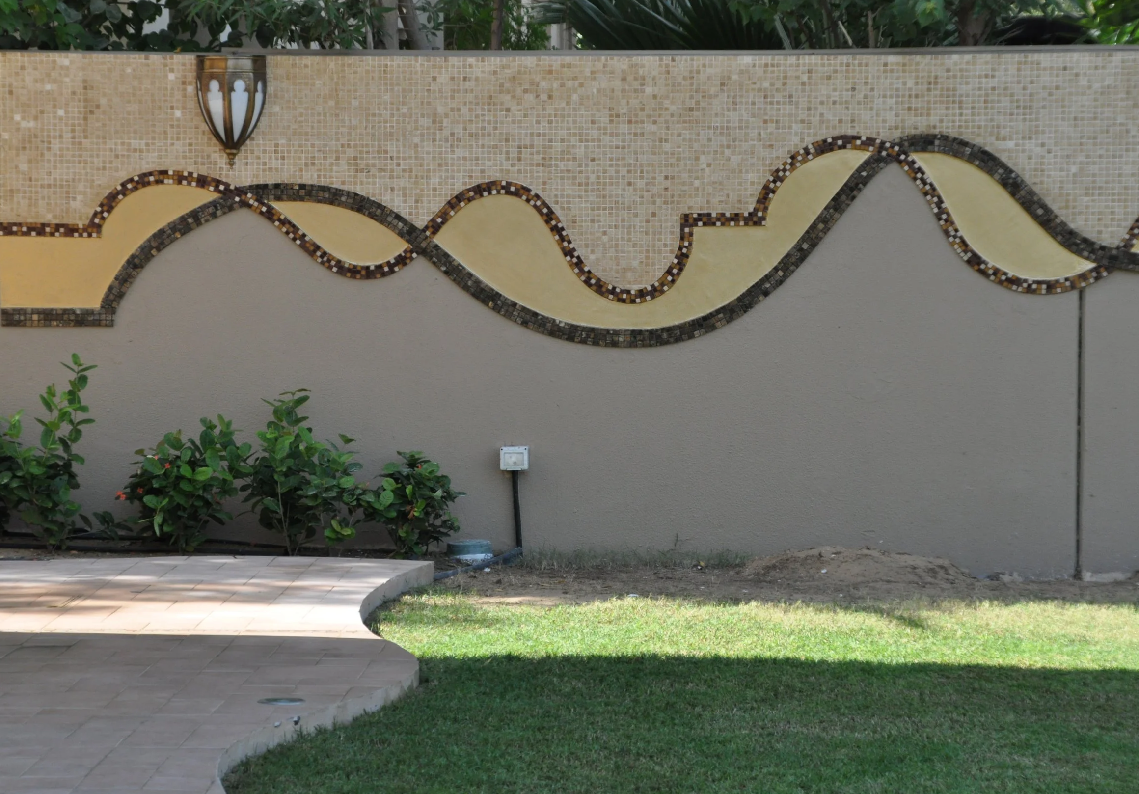 A work of collaboration with the client, the interior designer and the glass factory. Glass mosaic tiles with different textures were carfeully chosen and manufactured at the glass factory as per my design and stuck on painted canvas. This artwork enhances the home of an Emirati family in Dubai.