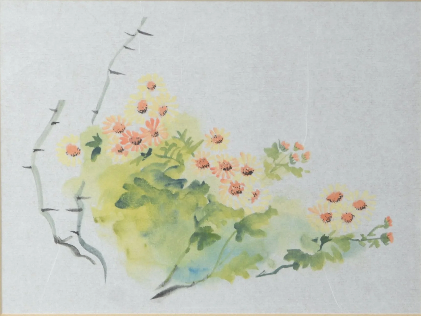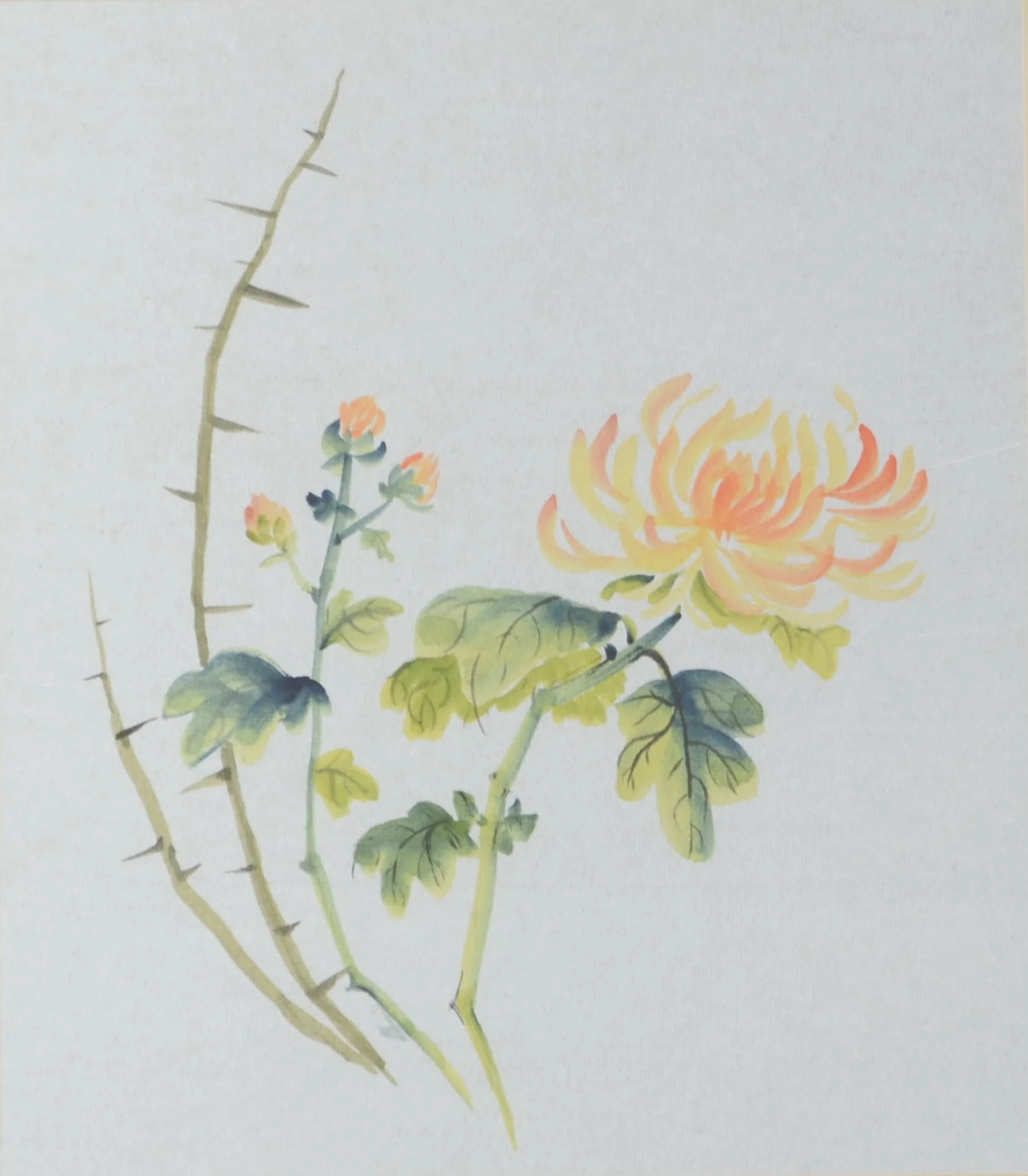 The chrysanthemum represents the fall season and is one of the four gentlemen in chinese brush painting. This flower symbolizes perseverance and strength.