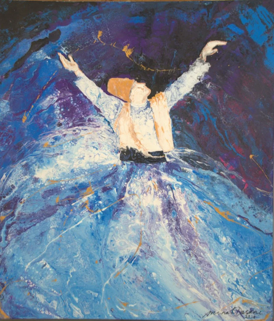Fluid acrylics swirl around with the whirling dervish as he loses himself in his devotion. A touch of copper depicts the purity of his soul.