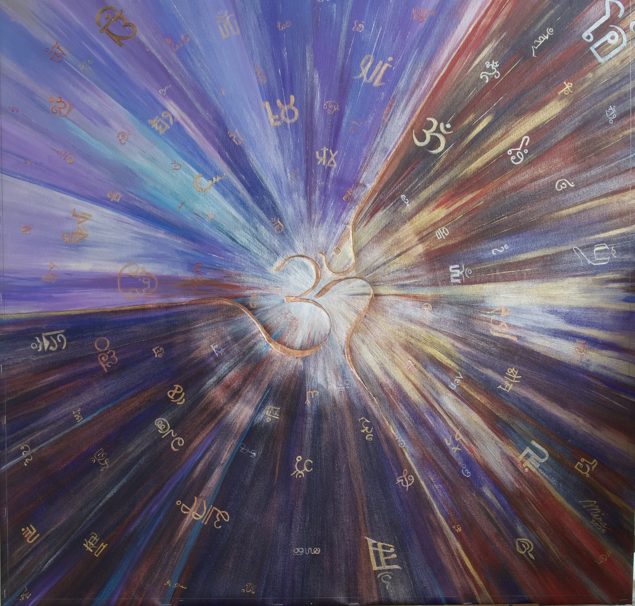 In this painting, the AUM form appears in its most widely recognised shape, dividing the canvas into three fields that suggest creation, preservation, and dissolution. Across cultures and belief systems, the number three recurs as a structure of balance and continuity — from trinities of becoming and transformation to paths of knowledge and practice. Variations of AUM appear in thirteen different languages around the central form, indicating a resonance that moves through cultures, geographies, and time.