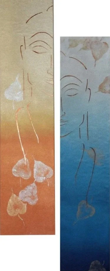 This diptych shows the Buddha in deep meditation — serene and balanced, held in quiet composure.