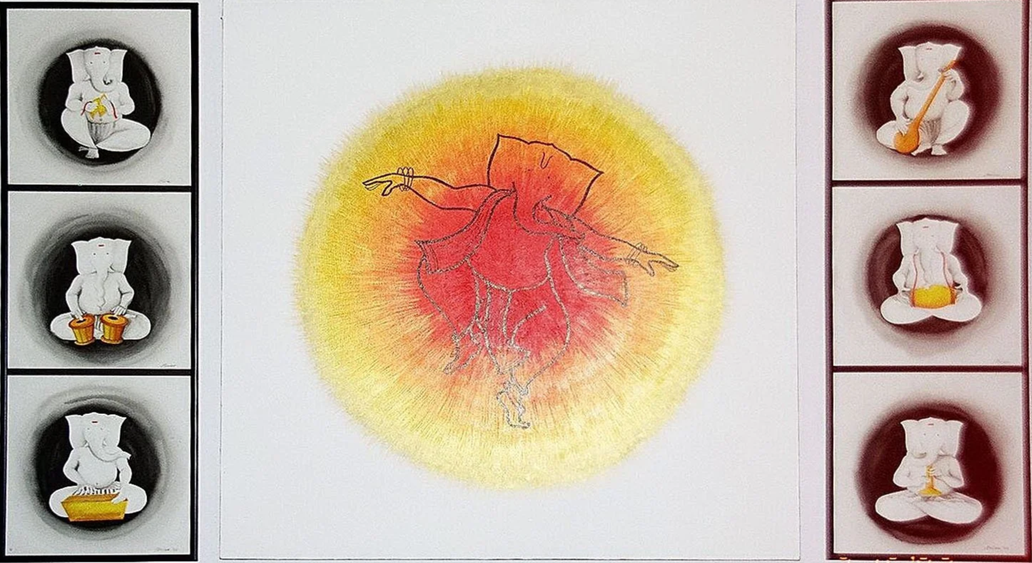 Ganesha is shown in a state of joyous movement, surrounded by musicians who are also forms of Ganesha. Dance and music unfold together, creating a shared rhythm that radiates outward.